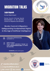 You are invited to the next Migration Talk organized by the Jean Monnet Chair in Legal Aspects of Migration Management in the European Union and in Türkiye by Leyla Kayac?k (Human Rights Expert/ Council of Europe Former Special Representative of the Secretary General on Migration and Refugees) on “Border Control & Migration: Safeguarding Fundamental Rights in the Age of Artificial Intelligence”.