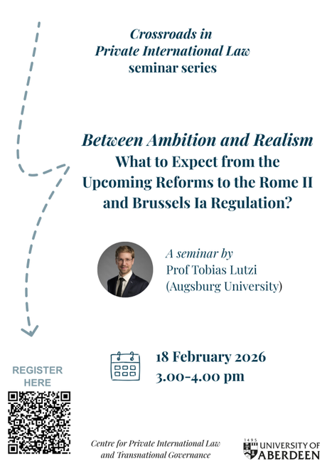 The Centre for Private International Law & Transnational Governance of the University of Aberdeen is continuing its Crossroads in Private International Law webinar series with a talk by Tobias Lutzi (University of Augsburg) titled ‘Between Ambition and Realism – What to Expect from the Upcoming Reforms to the Rome II and Brussels Ia Regulation?’: